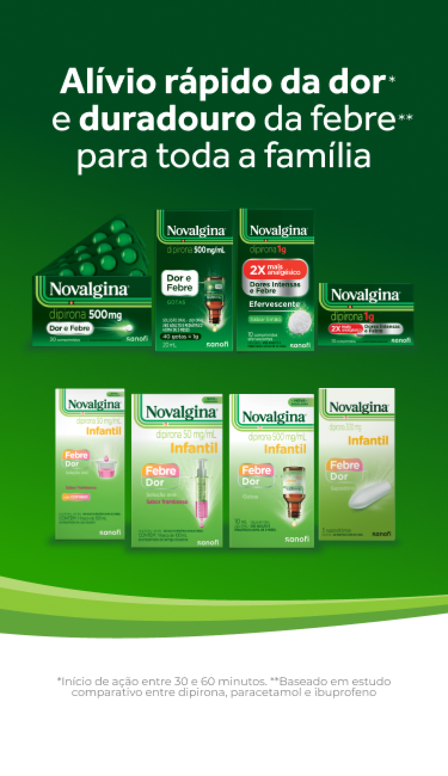 Novalgina® é a marca de analgésico e antitérmico mais recomendada pelos médicos10 e oferece soluções completas para o alívio da dor e da febre em diferentes fases da vida. Sua fórmula com dipirona garante alívio rápido** da dor1, inclusive as mais intensas9, e é comprovadamente mais eficaz no controle da febre, controlando a febre de leve a alta com a mesma eficácia1,7.
