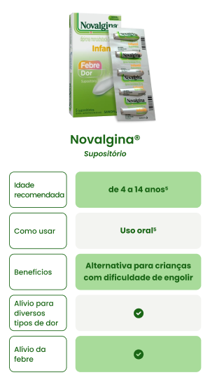 - Novalgina® Supositório [Bula do medicamento] Opella Healthcare Brazil LTDA. 15/02/2024